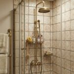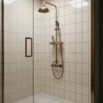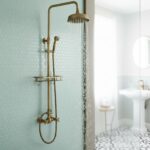 Niezwykle użytecznym elementem tego zestawu jest zintegrowana mosiężna półeczka na kosmetyki. Jest ona nie tylko stylowym dodatkiem, ale przede wszystkim funkcjonalnym rozwiązaniem, które pomieści flakony z szamponem, żele czy mydło. Konstrukcję dopełniają dwa solidne wieszaki umieszczone pod półką – idealne miejsce na zawieszenie myjki, szczotki do masażu czy ręcznika, dzięki czemu wszystko, co niezbędne, znajduje się zawsze pod ręką.